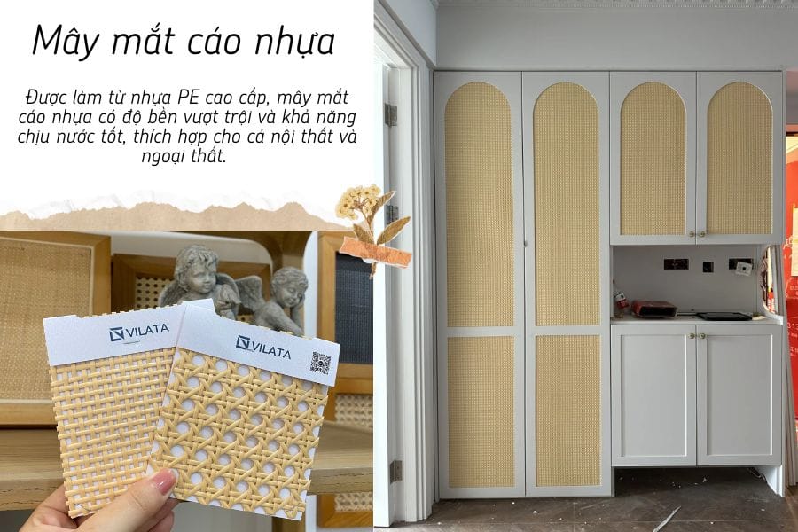 • Mây mắt cáo nhựa: Được làm từ nhựa PE cao cấp, mây mắt cáo nhựa có độ bền vượt trội và khả năng chịu nước tốt, thích hợp cho cả nội thất và ngoại thất. Với tính năng chống mối mọt và dễ dàng vệ sinh, đây là lựa chọn lý tưởng cho những ai yêu thích vẻ đẹp tự nhiên mà không cần lo bảo trì nhiều.