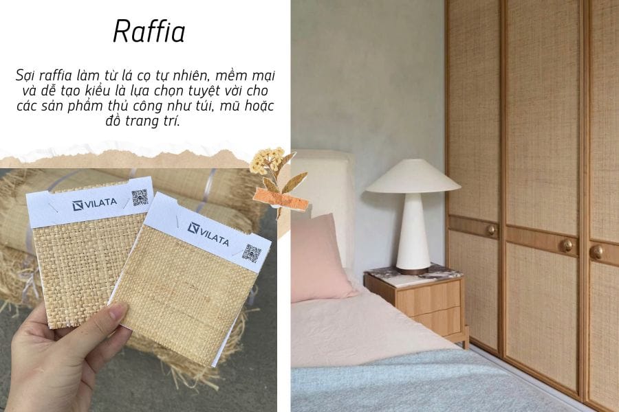 • Raffia: Sợi raffia làm từ lá cọ tự nhiên, mềm mại và dễ tạo kiểu là lựa chọn tuyệt vời cho các sản phẩm thủ công như túi, mũ hoặc đồ trang trí. Với màu sắc tự nhiên và độ bền cao, raffia giúp các sản phẩm thủ công trở nên thật nổi bật và ấn tượng.